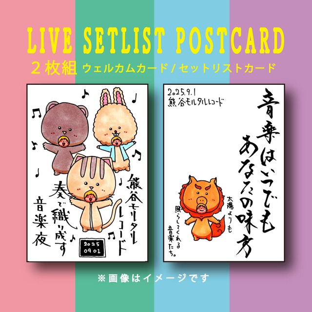 【ライブセットリストカードセット】 当日のセットリストが書いてあるカード、ウェルカムカードの2枚セット。 サインも書きます。